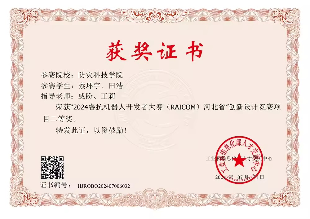 近日,2024睿抗机器人开发者大赛(RAICOM)全国总决赛在浙江杭州圆满举办。在永利集团官网蔡建羡、戚盼、王莉三位老师的指导下,由蔡环宇、田浩同学组成的队伍在创新设计竞赛项目中荣获二等奖,由袁芳、孟庆欣同学组成的队伍在智能系统竞赛项目中荣获三等奖。