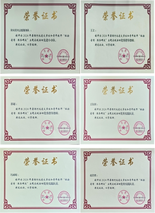 近日,由永利集团官网师生组成的防灾星火志愿服务队,获评2024年河北省“体验省情·服务群众”主题社会实践活动先进小分队,王立、郭越两名教师获评实践活动优秀指导教师,王钰田、冯雨晴、赵浩然三名学生获评优秀实践队员。