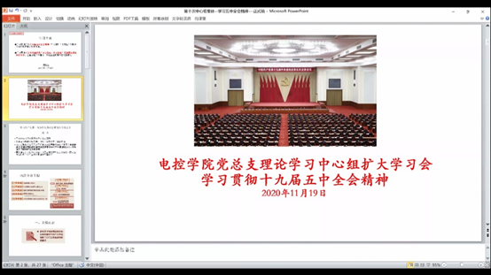 学院党总支副书记阎光耀首先带领大家学习贯彻党的十九届五中全会精神。中国共产党第十九届中央委员会第五次全体会议,于2020年10月26日至29日在北京举行,全会听取和讨论了习近平受中央政治局委托作的工作报告,审议通过了《中共中央关于制定国民经济和社会发展第十四个五年规划和二〇三五年远景目标的建议》,习近平就《建议(讨论稿)》向全会作了说明。接下来,阎光耀带领大家重新回顾历次全会主题,参会老师对于党的会议有了更加深刻的认识。
