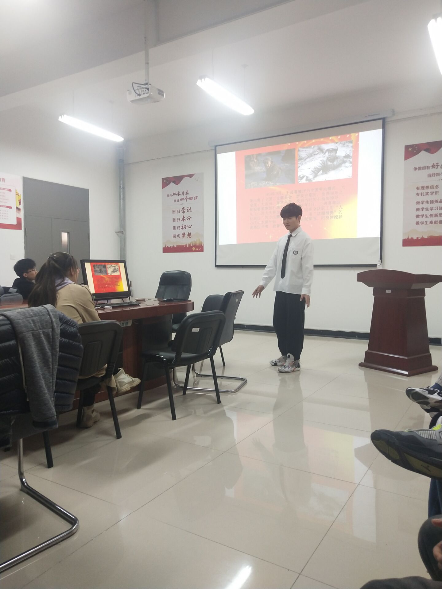 首先各个小组派出代表展示所准备的四史故事与ppt。第一小组讲述了焦裕禄全心全意为人民服务的事迹、黄继光英雄、事迹与抗美援朝的故事;第二小组共同学习了毛岸英抗美援朝、上甘岭战役的英雄、共和国勋章获得者张富清、铁人王进喜等英雄故事并分享了学习党史的重要意义和体会(图一);第三小组分别讲解了党史、新中国史、改革开放史、社会主义发展史的时间线与重要事件;第四小组鲜活的讲述了所熟悉的四史故事,红色历史故事、深刻理论,讲述中国共产党为人民谋幸福、为民族谋复兴、为世界谋大同的实践史(图二);第五小组展示了“开国大典”“南昌起义”与“井冈山革命根据地的建立”等重大历史事件;第六小组分组讲解自己准备的四史小故事(图三);第七小组以“遥望嘉兴梦红船”为开头生动形象的展示了几个小故事与新中国史的五个重要时期;第八小组介绍了“四史”包括的大概内容,新中国建设的内容,中国共产党的历史发展和中国近代史中著名的事件(图四)。之后,各个小组成员相互讨论学习心得。最后由各小组组长就学习情况进行总结并对各位积极分子提出期望。