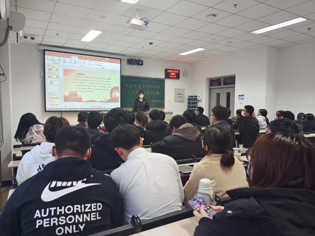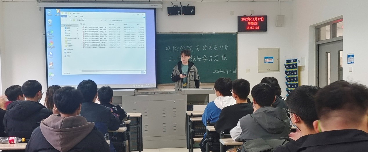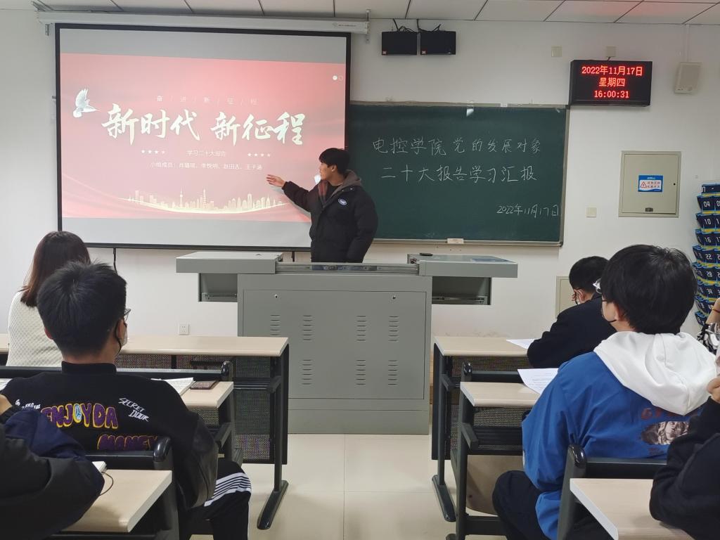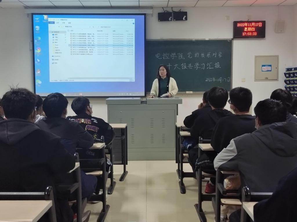 为深入学习领会党的二十大精神,推动党的二十大精神入脑入心,永利集团官网党总支于11月17日16:00在天仪楼113举办了党员发展对象二十大报告学习汇报活动。学院党总支书记贾甚杰、专职组织员王立、通信学生党支部书记胡治国、学生党建办公室负责同志以及全体党员发展对象参加活动,活动由党建办公室副主任王英杰同志主持。