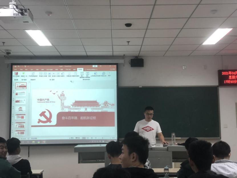 值此建党一百周年之际,180525班团支部为响应号召,深入学习贯彻党的十九大精神,学习中国共产党的光荣历史,于2021年4月10日下午5时,在天仪楼208教室举办了“奋斗百年路,启航新征程”主题团日活动,本次团日活动180525团支部全员参与,并特邀韩智明老师出席指导。